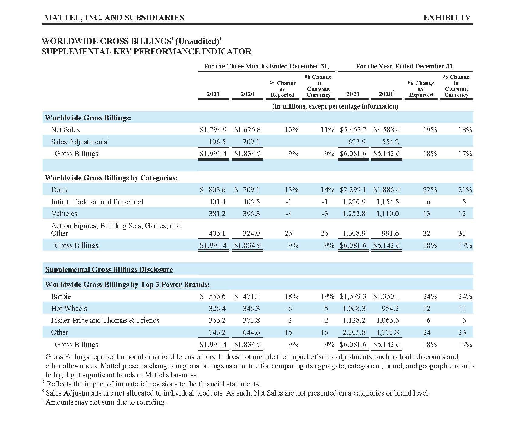 This press release contains a number of forward-looking statements within the meaning of the Private Securities Litigation Reform Act of 1995. Forward-looking statements can be identified by the fact that they do not relate strictly to historical or current facts. The use of words such as “anticipates,” “expects,” “intends,” “plans,” “confident that,” “believes,” and “targeted,” among others, generally identify forward-looking statements. These forward-looking statements are based on currently available operating, financial, economic, and other information and assumptions, and are subject to a number of significant risks and uncertainties. A variety of factors, many of which are beyond Mattel’s control, could cause actual future results to differ materially from those projected in the forward-looking statements, and are currently, and in the future may be, amplified by the COVID-19 pandemic. Specific factors that might cause such a difference include, but are not limited to: (i) potential impacts of and uncertainty regarding the COVID-19 pandemic (and actions taken in response to it by governments, businesses, and individuals) on Mattel’s business operations, financial results and financial position and on the global economy, including its impact on Mattel’s sales; (ii) Mattel’s ability to design, develop, produce, manufacture, source, ship, and distribute products on a timely and cost-effective basis; (iii) sufficient interest in and demand for the products and entertainment we offer by retail customers and consumers to profitably recover Mattel’s costs; (iv) downturns in economic conditions affecting Mattel’s markets which can negatively impact retail customers and consumers, and which can result in lower employment levels and lower consumer disposable income and spending, including lower spending on purchases of Mattel’s products; (v) other factors which can lower discretionary consumer spending, such as higher costs for fuel and food, drops in the value of homes or other consumer assets, and high levels of consumer debt; (vi) potential difficulties or delays Mattel may experience in implementing cost savings and efficiency enhancing initiatives; (vii) other economic and public health conditions or regulatory changes in the markets in which Mattel and its customers and suppliers operate, which could create delays or increase Mattel’s costs, such as higher commodity prices, labor costs or transportation costs, or outbreaks of disease; (viii) currency fluctuations, including movements in foreign exchange rates and inflation, which can lower Mattel’s net revenues and earnings, and significantly impact Mattel’s costs; (ix) the concentration of Mattel’s customers, potentially increasing the negative impact to Mattel of difficulties experienced by any of Mattel’s customers, such as bankruptcies or liquidations or a general lack of success, or changes in their purchasing or selling patterns; (x) the inventory policies of Mattel’s retail customers, as well as the concentration of Mattel’s revenues in the second half of the year, which coupled with reliance by retailers on quick response inventory management techniques increases the risk of underproduction, overproduction , and shipping delays; (xi) legal, reputational, and financial risks related to security breaches or cyberattacks; (xii) work disruptions, including as a result of supply chain disruption and plant shutdowns, which may impact Mattel’s ability to manufacture or deliver product in a timely and cost-effective manner; (xiii) the impact of competition on revenues, margins, and other aspects of Mattel’s business, including the ability to offer products which consumers choose to buy instead of competitive products, the ability to secure, maintain, and renew popular licenses from licensors of entertainment properties, and the ability to attract and retain talented employees and adapt to evolving workplace models; (xiv) the risk of product recalls or product liability suits and costs associated with product safety regulations; (xv) changes in laws or regulations in the United States and/or in other major markets, such as China, in which Mattel operates, including, without limitation, with respect to taxes, tariffs, trade policies, or product safety, which may increase Mattel’s product costs and other costs of doing business, and reduce Mattel’s earnings; (xvi) failure to realize the planned benefits from any investments or acquisitions made by Mattel; (xvii) the impact of other market conditions or third party actions or approvals, including that result in any significant failure, inadequacy, or interruption from vendors or outsourcers, which could reduce demand for Mattel’s products, delay or increase the cost of implementation of Mattel’s programs, or alter Mattel’s actions and reduce actual results; (xviii) changes in financing markets or the inability of Mattel to obtain financing on attractive terms; (xix) the impact of litigation, arbitration, or regulatory decisions or settlement actions; (xx) Mattel’s ability to navigate regulatory frameworks in connection with new areas of investment, product development, or other business activities, such as non-fungible tokens and cryptocurrency; (xxi) uncertainty from the expected discontinuance of LIBOR and transition to any other interest rate benchmark; and (xxii) other risks and uncertainties as may be described in Mattel’s filings with the Securities and Exchange Commission, including the “Risk Factors” section of Mattel’s Annual Report on Form 10-K for the fiscal year ended December 31, 2020 and subsequent periodic filings, as well as in Mattel’s other public statements. Mattel does not update forward-looking statements and expressly disclaims any obligation to do so, except as required by law.